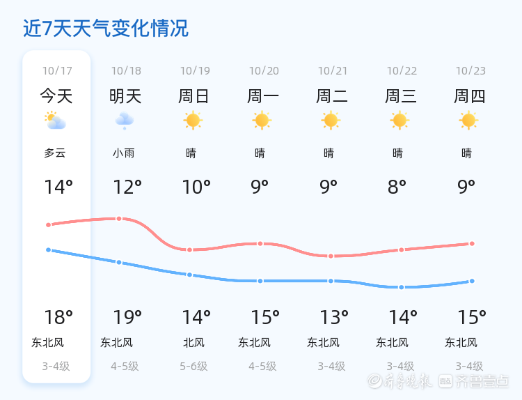 未来三天(10月19日至10月21日),青岛市天气将以晴朗为主,但气温将有较大幅度下降,最低气温降至10℃,最高气温为15℃左右。风力方面,北风和东北风为主,风力在3-6级之间。建议市民根据天气变化及时增添衣物,尤其是早晚温差较大,老人和儿童需特别注意保暖。