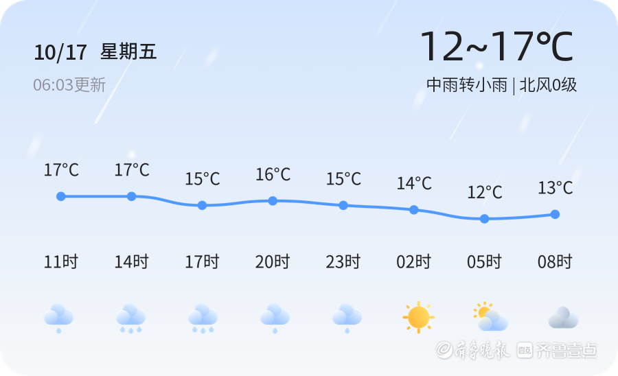 今天是10月17日,星期五,农历八月廿六。潍坊市迎来中雨转小雨天气,气温在12℃至17℃之间,北风0级,空气湿度100%,PM2.5指数为46,空气质量为良。市民外出需携带雨具,注意防寒保暖。由于降雨可能影响路面湿滑,建议市民出行时减速慢行,保持车距,确保行车安全。