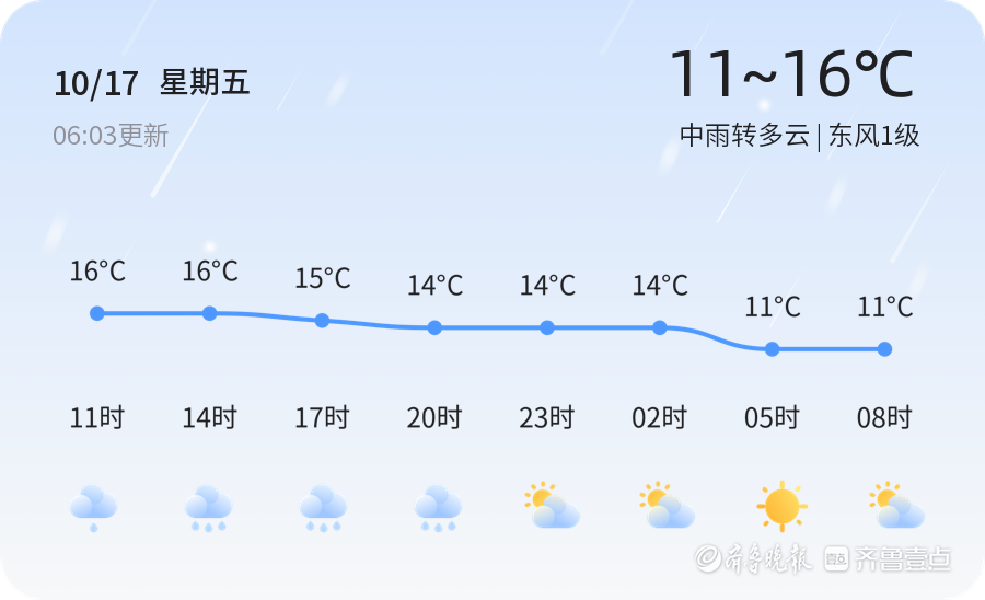 今天是10月17日,星期五,农历八月廿六。泰安市迎来中雨转多云天气,温度在11℃至16℃之间。各区普遍有小雨,气温适中,湿度较高,空气质量良好。