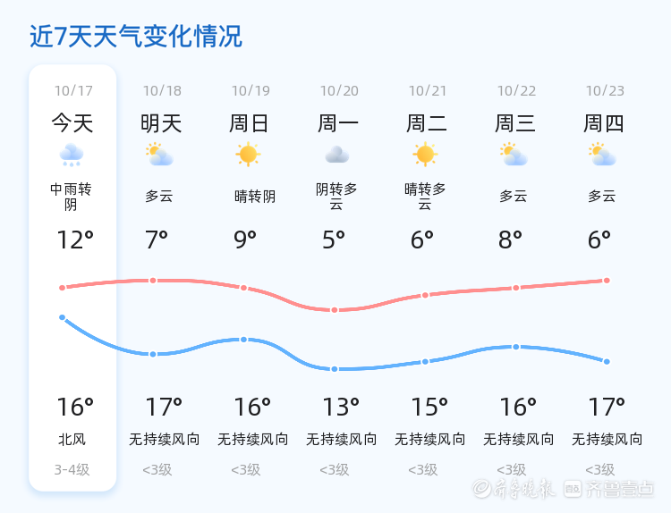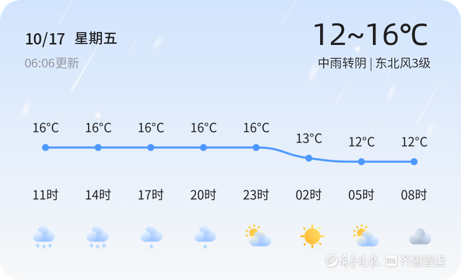 今天是2025年10月17日,星期五,农历八月廿六。菏泽市今日天气为中雨转阴,气温介于12℃至16℃之间,东北风3级。空气湿度高达96%,PM2.5指数为32,空气质量良好。各区天气情况基本一致,均为中雨转阴,市民出行需携带雨具并注意防寒保暖。