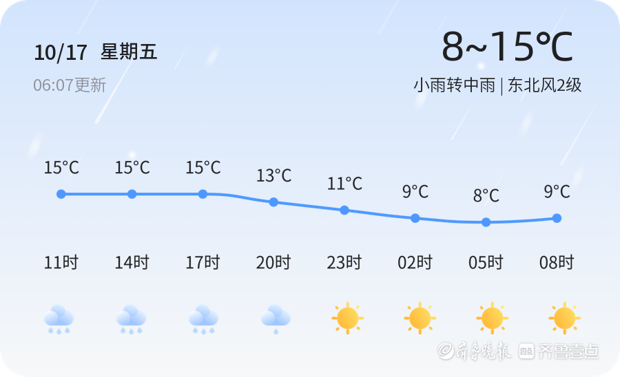 今天是10月17日,星期五,农历八月廿六。德州迎来小雨转中雨天气,气温在8到15摄氏度之间。东北风2级,空气湿度高达95%,PM2.5浓度为38,属于良好级别。降雨天气可能导致道路湿滑,建议市民出行携带雨具,注意行车安全,减速慢行,确保出行安全。 未来三天,德州天气以阴雨为主,气温波动较大。今天到周六,最高气温维持在15摄氏度,最低气温将降至4摄氏度。周六和周日,天气多云转阴,气温逐步下降,周日最低气温仅为4摄氏度。市民需注意保暖,及时增添衣物,雨天出行请携带雨具,避免感冒。 温馨提示