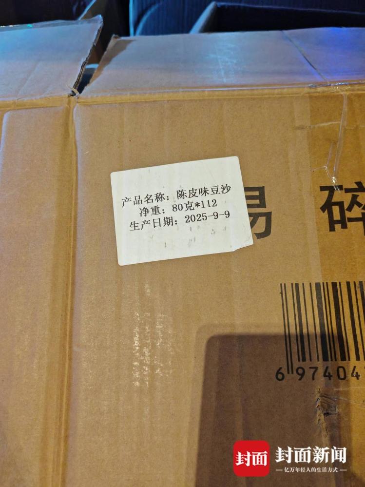 摊主随即取出一个纸箱,表示散装月饼均是由大纸箱包装。纸箱外侧印有生产日期为“9月9日”。当问及保质期是多久,摊主答是“6个月”。