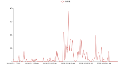 如图所示,有关2025首届中国国风时尚周的信息传播于活动开始后的第87天,即2025年10月14日达到最高活跃峰值,当天信息传播数量为38条,占全部信息总量的7.77%。