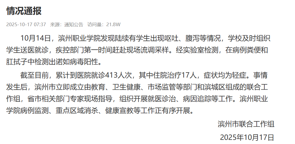截至目前,累计到医院就诊413人次,其中住院治疗17人,症状均为轻症。事情发生后,滨州市立即成立由教育、卫生健康、市场监管等部门和滨城区组成的联合工作组,省市相关部门专家现场指导,组织开展就医诊治、病因追踪等工作。滨州职业学院病例监测、重点区域消杀、健康宣教等工作正有序开展。