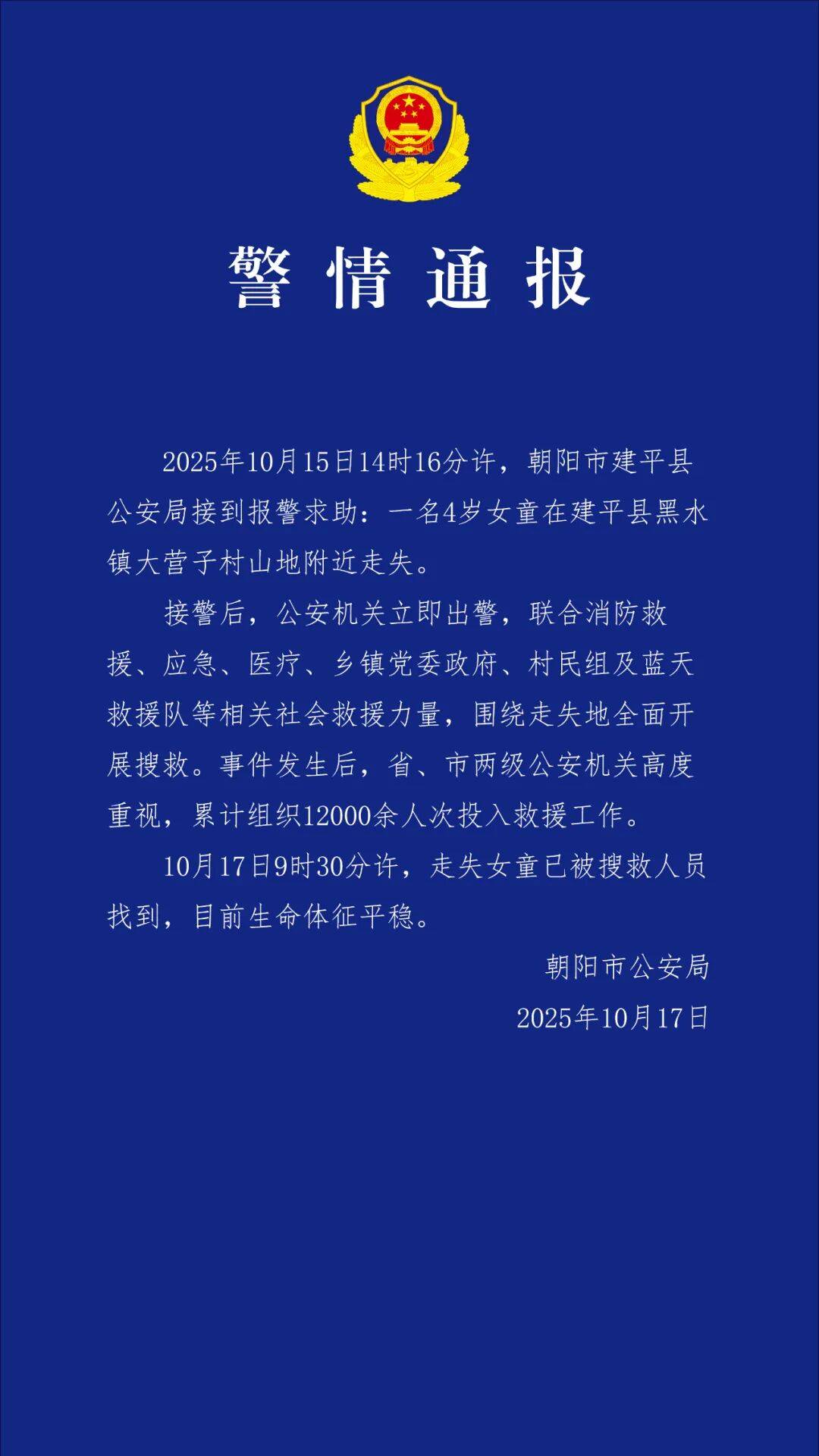 10月17日,辽宁朝阳市公安局发布警情通报:4岁失联女童已找到,生命体征平稳。