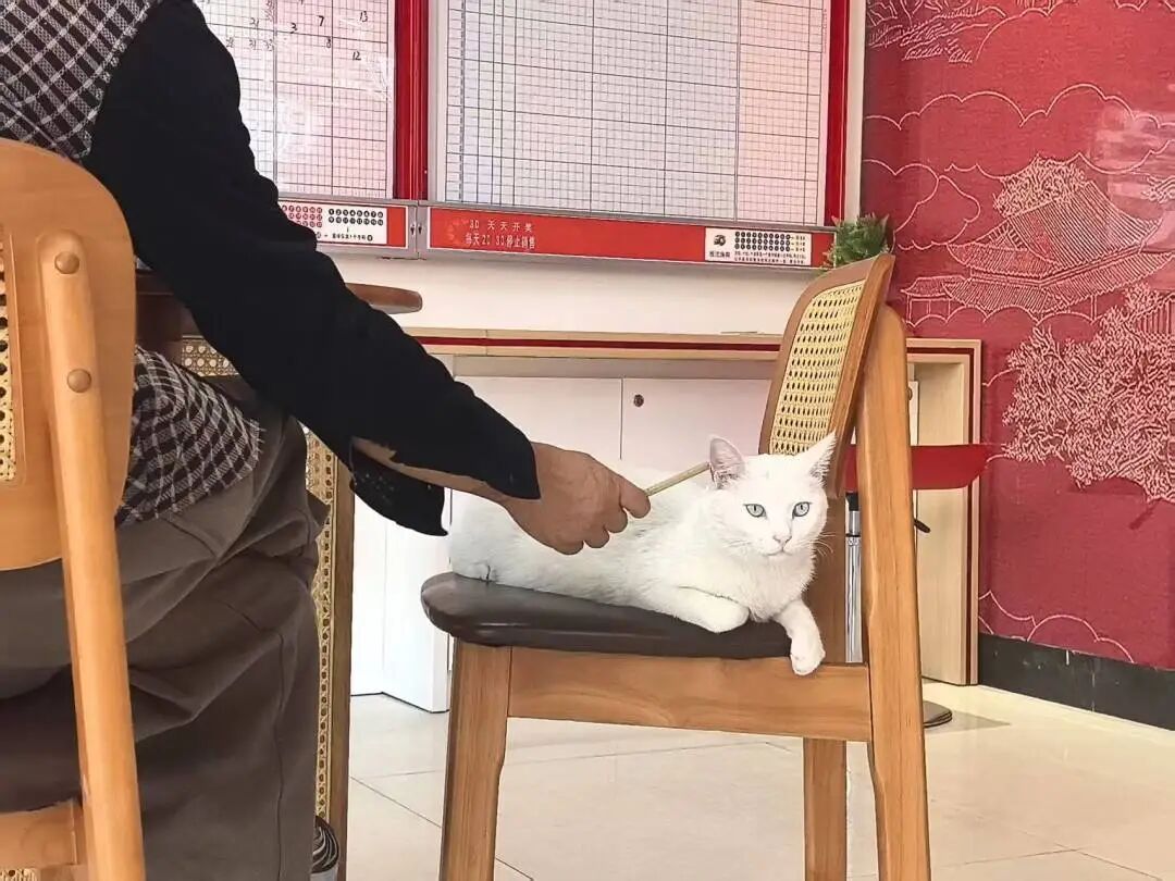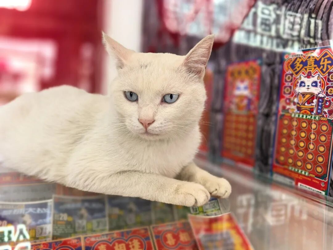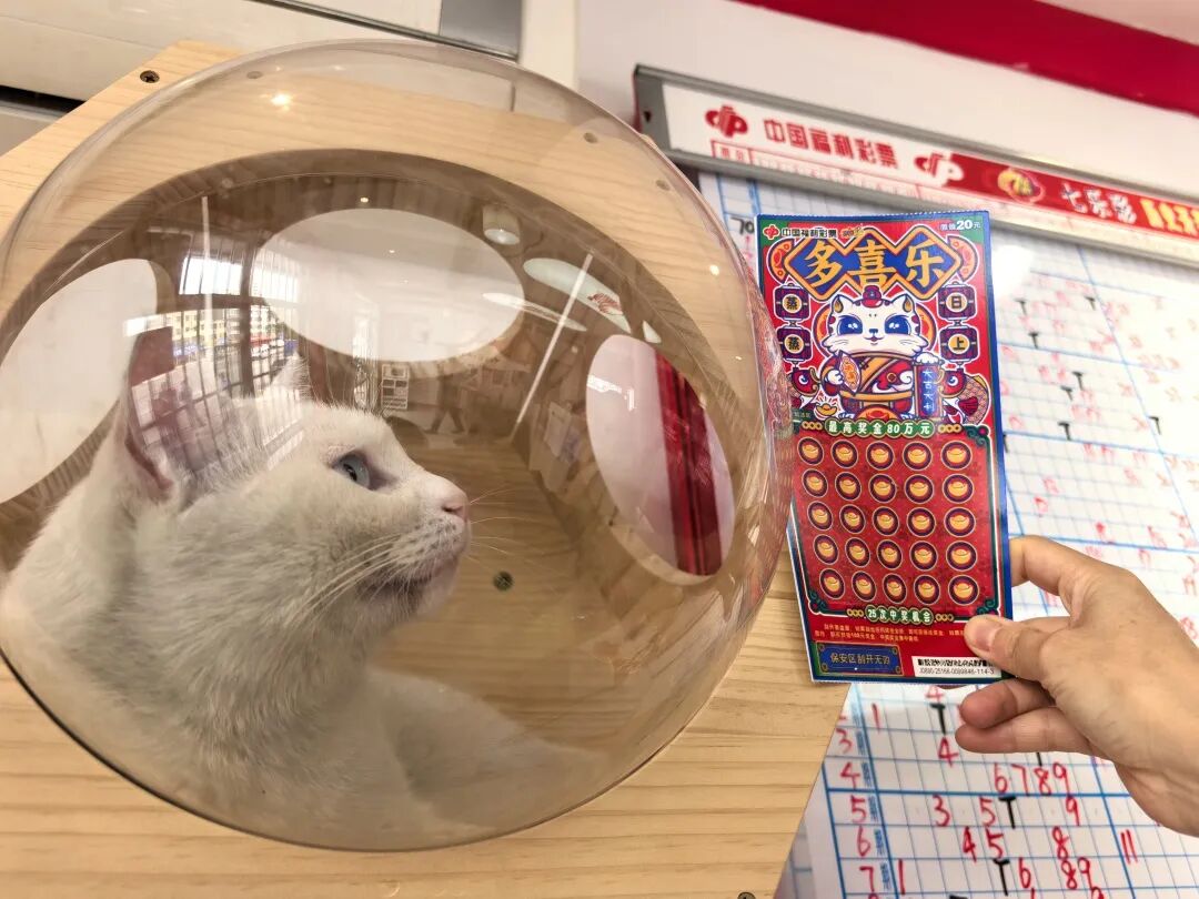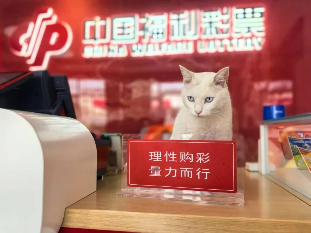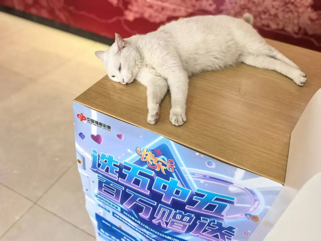 据业主杨伟介绍,自己的第一份职业就是福彩销售,十余年来,每天都过得忙碌而充实。至于为何会在“快乐吧”主题店中融入“猫咪乐园”的元素,杨伟回忆了这样一段往事:“2021年夏天,那天正在下大雨,我撑着伞路过一辆报废汽车时,一只被雨淋湿的瘦弱猫咪突然从车底跑出来,一边可怜地‘喵喵’叫,一边打着哆嗦顺着裤腿往我身上爬。我站着不动了,猫咪就抬头望着我叫,两只湛蓝的眼睛好像在说:‘好心人,带我回家吧,我又冷又饿,害怕极了。’当时心一软,就把猫咪抱回了家。洗干净才发现是一只通体纯白的猫咪。后来我就天天带着它去彩站。这只猫性格特别好,不乱跑,也不发脾气,谁抱都可以。彩友们都很喜欢它,他们还给它起了个很传统的名字‘赵白菜’,谐音‘招百财’。养到现在,爱让它重新长出了血肉,已经是12斤重的健康猫猫啦!”