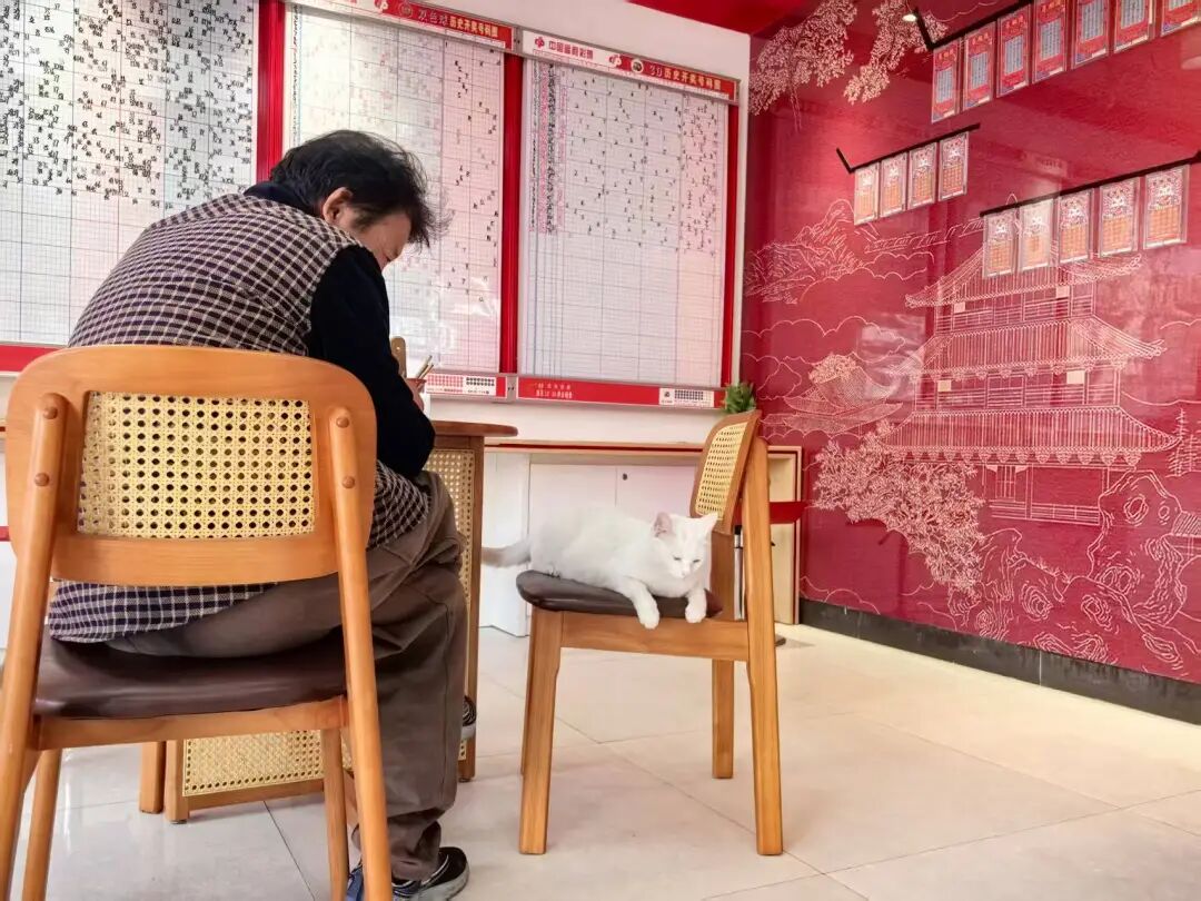 恰逢销售网点升级,杨伟比较中意新中式的装修风格,小猫天天陪自己上班,干脆给“赵白菜”设计个“猫咖”,不仅是37015012号销售场所的独特风景,也能让彩友沉浸式购彩之余愉悦地撸猫,情绪价值拉满。