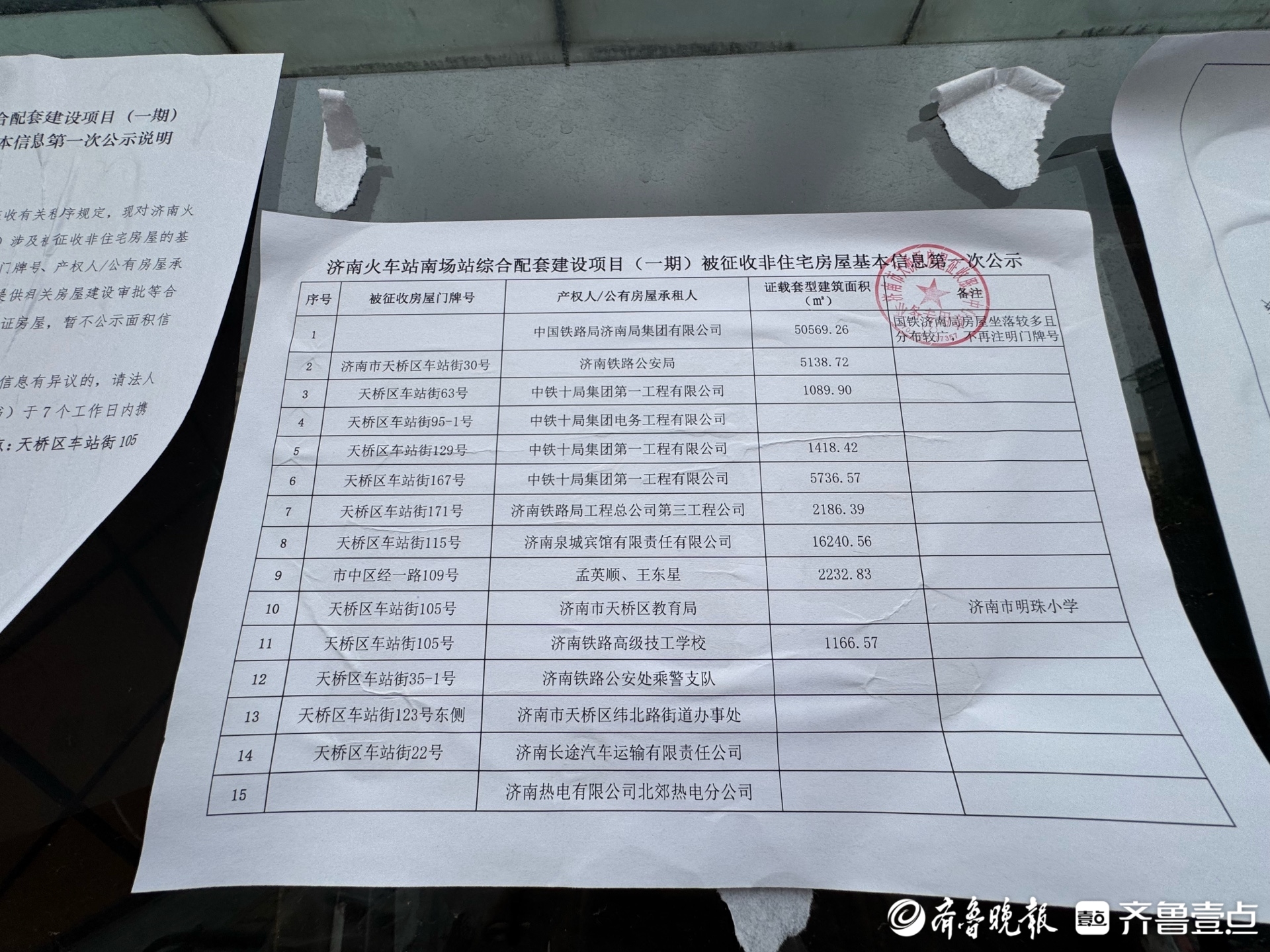 10月19日,济南火车站南广场附近的天龙大厦四周已立起围挡,部分商户已搬离。 大厦一楼,除了此前张贴了济南市天桥区住房和城乡建设局发布的《征收冻结通告》,还张贴了一张《济南火车站南场站综合配套建设项目(一期)被征收非住宅房屋基本信息第一次公示》表,除了天龙大厦,车站西侧的部分楼宇也在拆迁之内。 根据济南市天桥区住房和城乡建设局发布的《征收冻结通告》,济南火车站南场站综合配套建设项目启动房屋征收,征收范围东至站前路,西至国铁济南局车辆段及规划车站街,南至经一路,北至济南站站房。