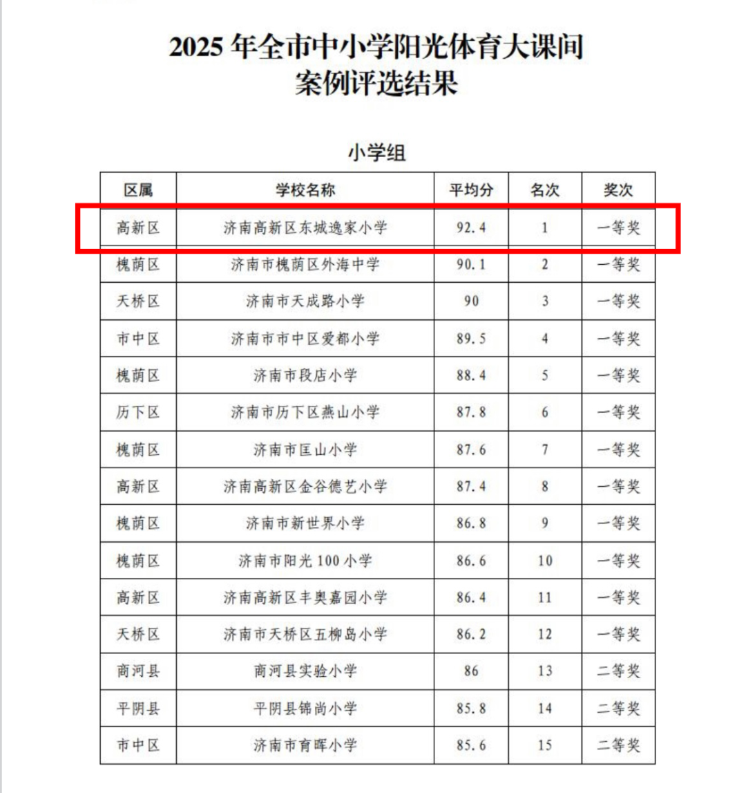 在刚刚落幕的济南市“阳光大课间”展示评比活动中,济南东城逸家小学的学子们凭借整齐划一的动作、朝气蓬勃的精神面貌和富有创意的编排,在115所参赛学校中脱颖而出,以92.4分的高分荣获济南市一等奖第一名的骄人成绩!这份亮眼的“成绩单”,是学校深耕体育教育、践行“健康第一”理念的生动见证,更是全体师生用汗水浇灌出的硕果。一直以来,东城逸家小学高度重视体育工作,将阳光大课间作为提升学生身体素质、涵养精神风貌的重要载体。学校因地制宜,科学、系统、智慧地开展体育活动整体设计和创造性实施,将趣味运动、传统体育与体能训练有机融合,既丰富了学生的课间生活,也切实提升了体育活动的综合实效。