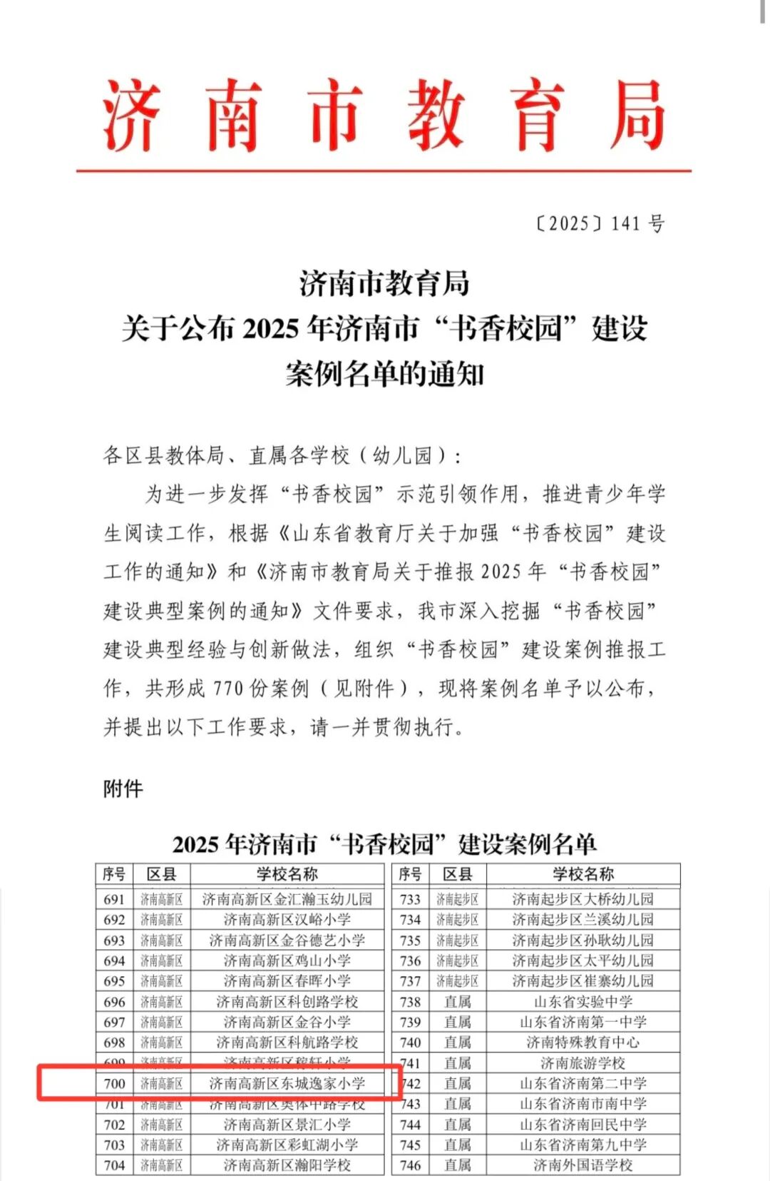 根据《山东省教育厅关于加强“书香校园”建设工作的通知》和《济南市教育局关于推报 2025 年“书香校园”建设典型案例的通知》文件要求,济南高新区东城逸家小学深入挖掘“书香校园”建设典型经验与创新做法,成功入选济南市“书香校园”建设案例。