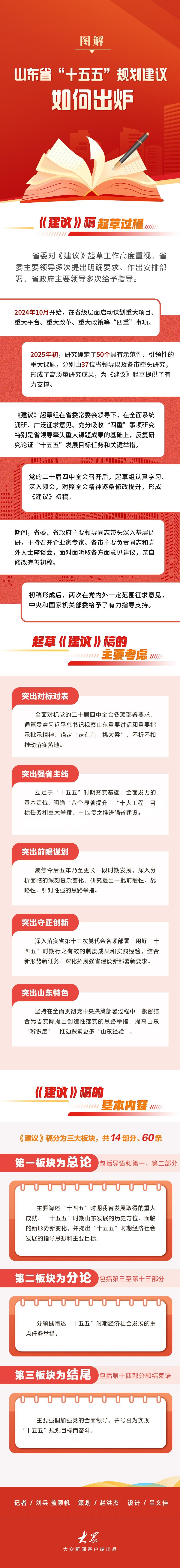 《建议》全面贯彻党的二十届四中全会精神,深入落实习近平总书记视察山东重要讲话和重要指示批示精神,坚定扛牢“走在前、挑大梁”使命担当,立足“十五五”山东发展所处历史方位和面临的新形势新变化,提出了“十五五”时期我省发展的指导思想、主要目标和重点任务,充分体现了中央要求、时代特征、山东特色和群众期盼,是对今后五年全省经济社会发展的总体规划和系统部署。
